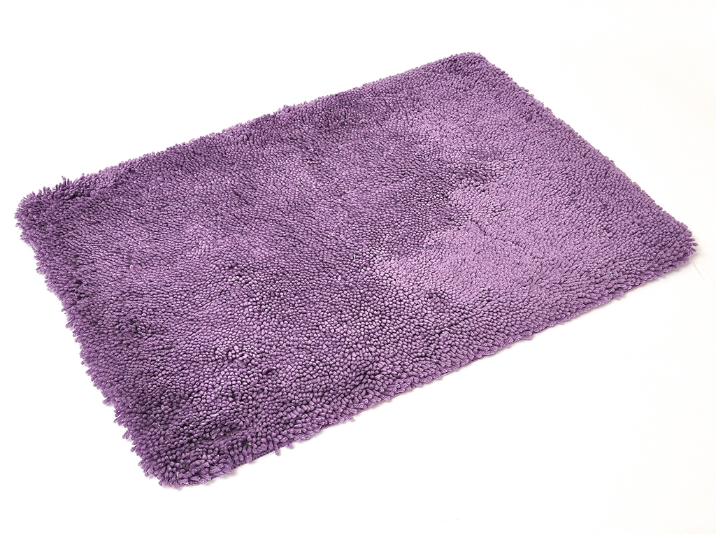 Текстильный коврик для ванной комнаты фиолетового цвета. Длина ворса 3 см. Нижняя часть с латексным напылением, препятствующим скольжению коврика по полу.